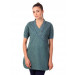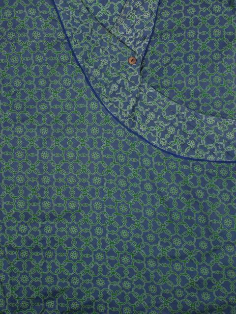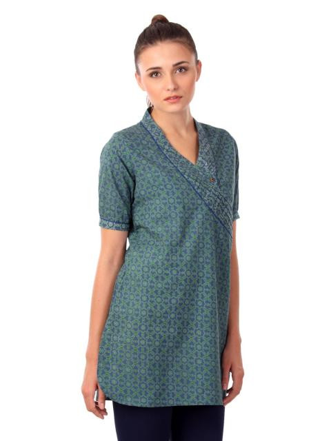 Blue printed kurta has a cross over V neck with panelling with thread detailing, has a button on one side of it, with thin blue piping along it, short sleeves with button closure at the cuffs, a curved and vented hem