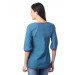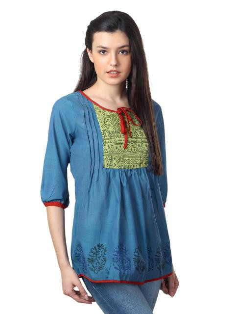 Blue kurti, has red toe ups at the round neck, green yoke, has three quarter sleeves with an elasticated cuffs, a flaring skirt and a curvved hem