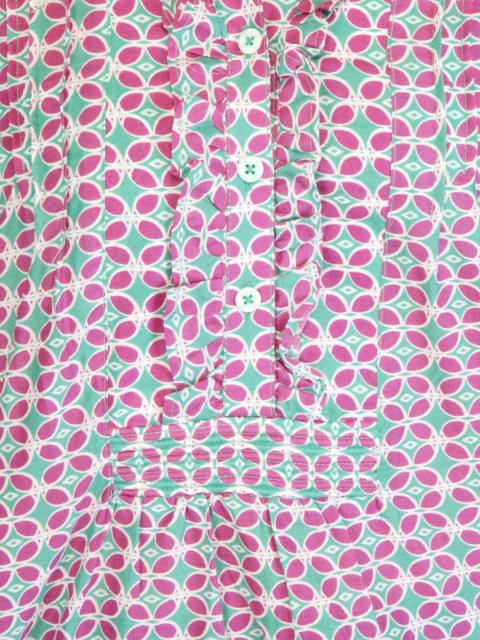 Magenta pink and green kurti with round neckline, short elasticated sleeves, chest placket and pleats in the front