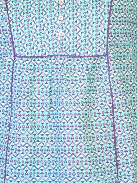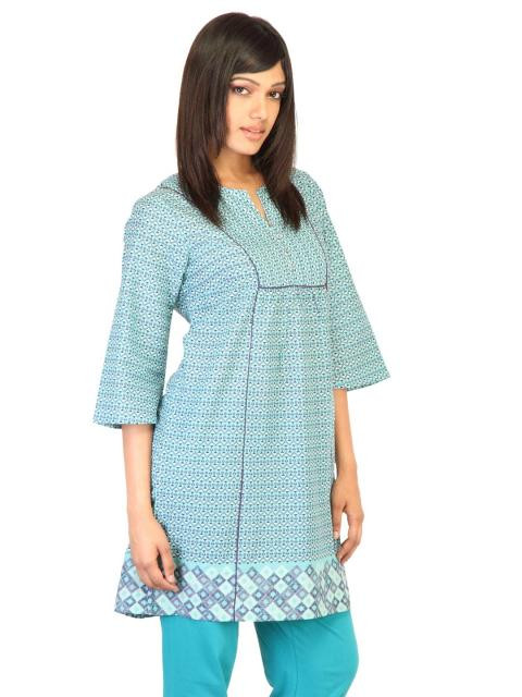 Blue kurti made of 100% cotton, has a round neck with a slit and a buttoned placket, purple piping along the yoke, three-quarter sleeves and side slits