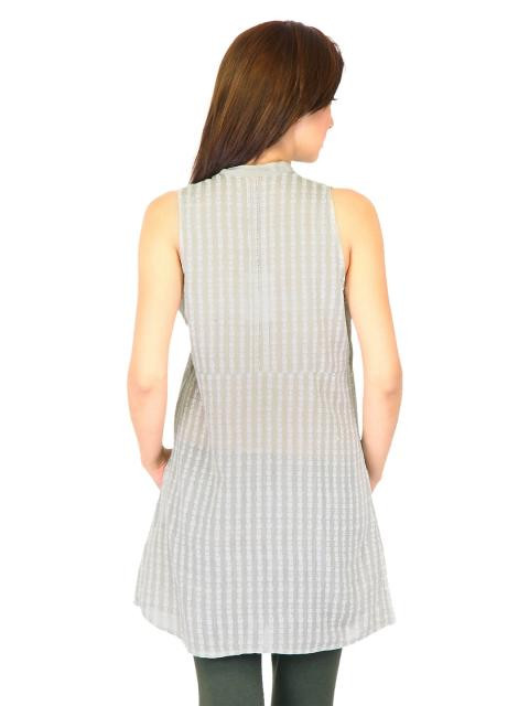Stone coloured sleeveless kurta made of 100% cotton, has a mandarin neckline with Hakoba style detailing along the yoke and a full front buttoned placket