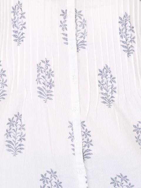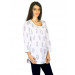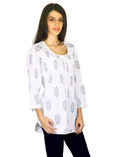 White printed kurta made of 100% cotton, with three quarter sleeves, has a round neckline with tape detailing on the upper chest panel and has a curved hemline