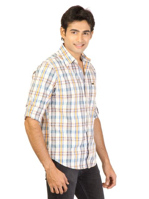 White shirt with navy blue and yellow checks, made of 100% cotton, has a chest pocket, full front buttoned placket, full sleeves with mid-sleeve buttoned flaps, and a curved hemline
