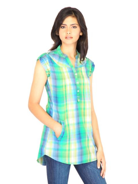 Upgrade your feminine casual style with this checked green and yellow shirt from lee. The pin tucks on the upper bust adds an element of interest, while the tunic desing accentuates your figure. Team this with leggings and lifestyle footwear from the wide collection available at myntra for casual occasions.
