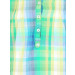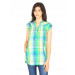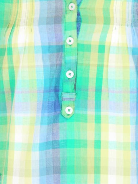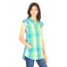 Light green and yellow checked pleated tunic top with light blue accents, made of 100% cotton, has mega sleeves which can be rolled up and fastened with buttoned flaps, modified mandarin collar with tape detailing on the inseam, buttoned placket on the front extending till the waist, pin tuck detailing on the upper bust area, insert pockets on the sides and has a curved hemline