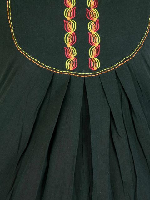 Black kurta made of 100% organic cotton, has a square neck with a bib that has floral embroidery, bishop sleeves mildly pleated at the shoulder and mildly elasticated at the hem, embroidery at the hem and pleated below the bib