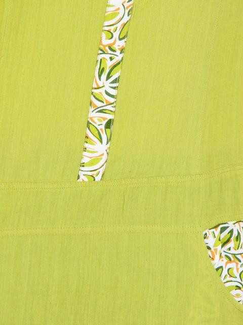 Green kurta made of 100% cotton, has very short cap sleeves with printed piping, round neck with a buttoned chest placket, printed fabric piping along the neckline and along the placket extending to the drop waist and has pockets at either hip with printed panels inside