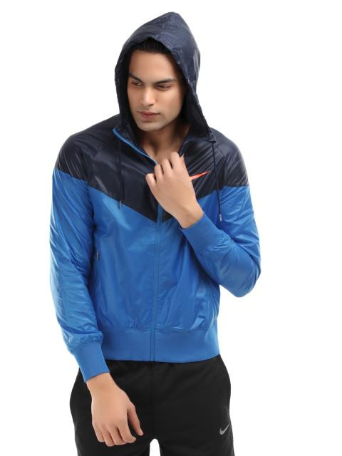 Navy blue and bright blue colour blocked jacket, has a hood with drawstrings, panelled long raglan sleeves with ribbed cuffs, contrast open-ended zip closure down front, fluorescent printed branding at left chest, zip fastened pockets at front waist, vented back yoke, ribbed hem, airtex lining, and velcro fastened welt pocket built into the lining at left chest