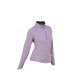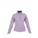 Purple sweatshirt made of 80% polyester and 12% spandex, has long raglan sleeves with asymmetrical cuffs, a mock neck with a half zippered placket and printed branding logo on the left chest