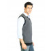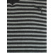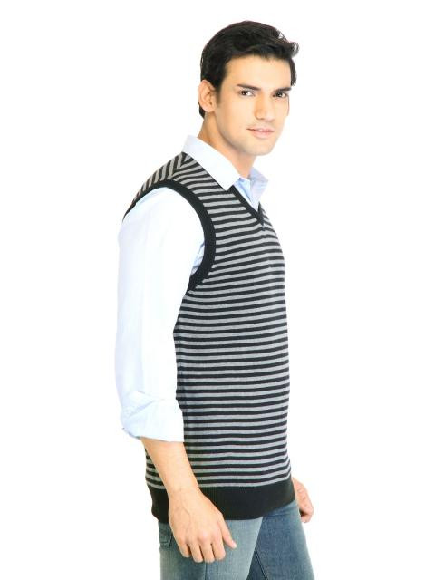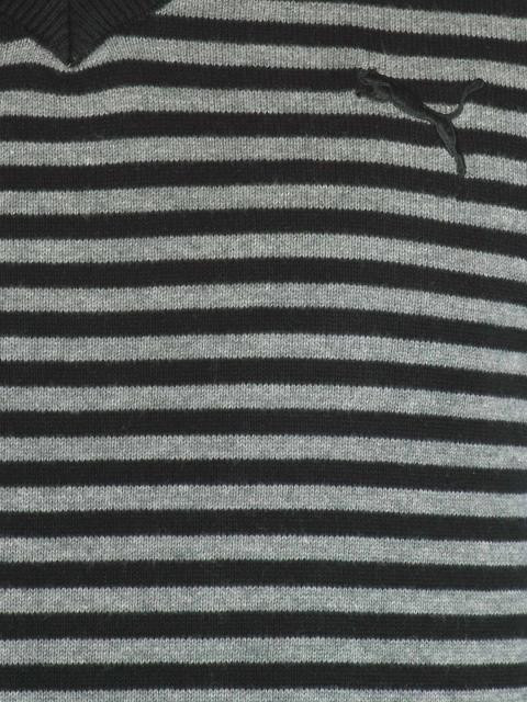 Grey and black striped sleeveless knit vest made of 100% cotton, has a V-neck, ribbed armholes, neckline and hem, and embroidered brand logo on the left chest
