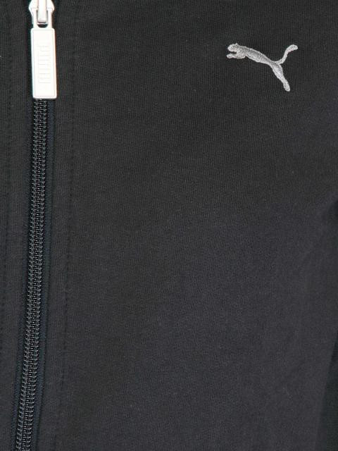Black sweatshirt made of 80% cotton and 20% polyester, has long sleeves with ribbed cuffs, full front zipper with a ribbed hem, has two pockets on the waist, and brand logo embroidered on the left chest and printed on the nape of the neck