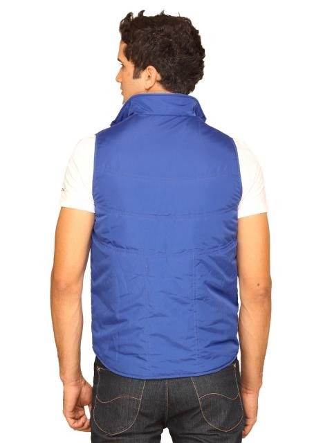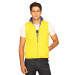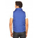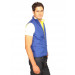 Blue and yellow sleeveless zippered jacket made of 100% polyester, with a built-up neckline, reversible, thick cotton ribbed linng around neckline on one side, buttoned pockets and one zipper pocket on one side,side pockets on the other, and brand name in reflective print on both sides