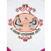 White romper with pink piping along the neckline, has a round neckline, short sleeves, pink border and press buttoned opening at the hem and a graphic print in front over the chest