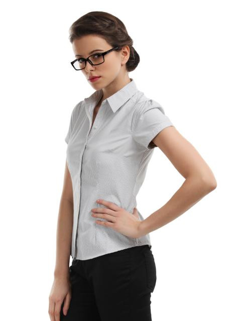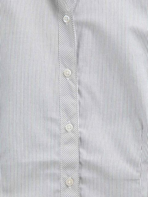 Black on white pin striped shirt, spread collar, full length placket, short puff sleeves, curved hem, yoke
