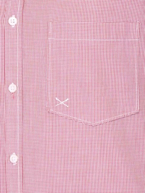Full sleeves shirt with red and white gingham checks, made of 100% cotton, patch pocket on the left chest with embroidered brand logo, full length buttoned placket, godet inserts on the sides and a curved hemline