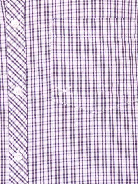 Half sleeve shirt with purple and white checks, made of 100% cotton, has a patch pocket on the left chest with embroidered brand logo, full length buttoned placket, godet inserts on the sides and a curved hemline