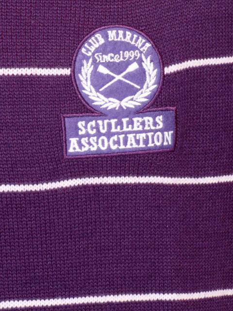 Black full sleeves pullover with horizontal white stripes, made of 80% acrylic and 20% wool, has a V-neck, ribbed neckline, cuff and hem, with brand badge appliqued on the left chest