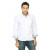 White full sleeves shirt made of 60% cotton and 40% polyester, has dobby weaving in black thread on the front, a full length buttoned placket and a curved hemline