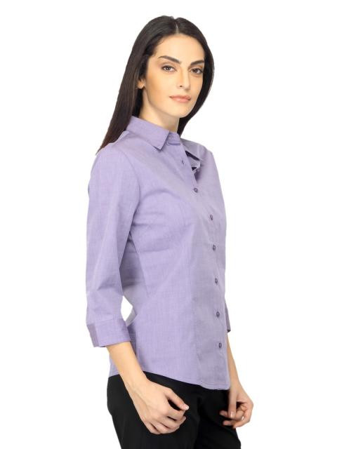 Purple shirt made of 100% cotton, has a spread collar, three quarter sleeves with single button cuffs, full buttoned placket, brand badge above the left hem and a curved hem