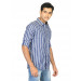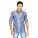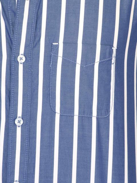 Blue and white striped full-sleeve shirt made of 100% cotton, has a tipped collar with buttons and a full front buttoned placket, a chest pocket on the left, full sleeves, and a curved hem with red panel detailing