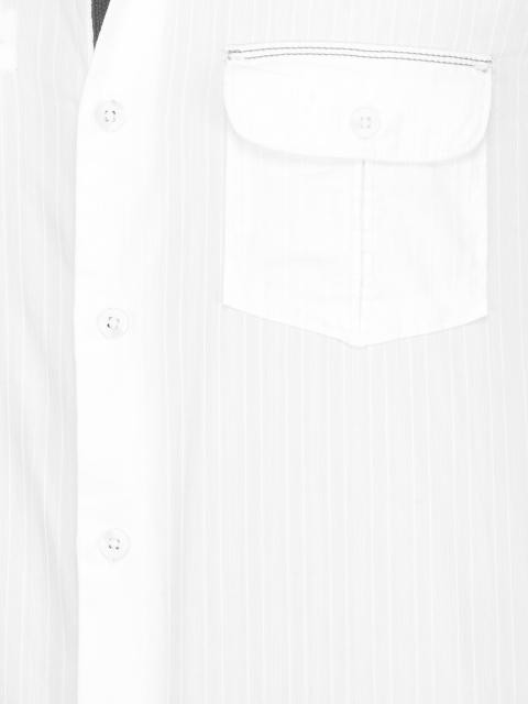White full-sleeve shirt made of 100% cotton, has woven stripes in white, a tipped collar with buttons, full front button placket, pocket on the left chest, and has a curved hem