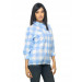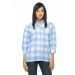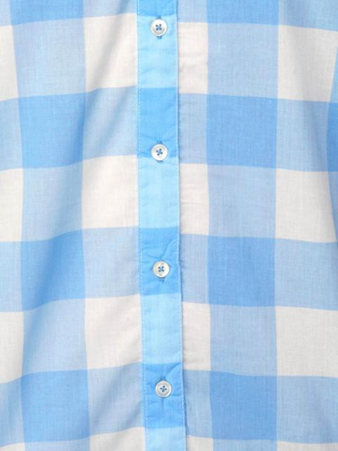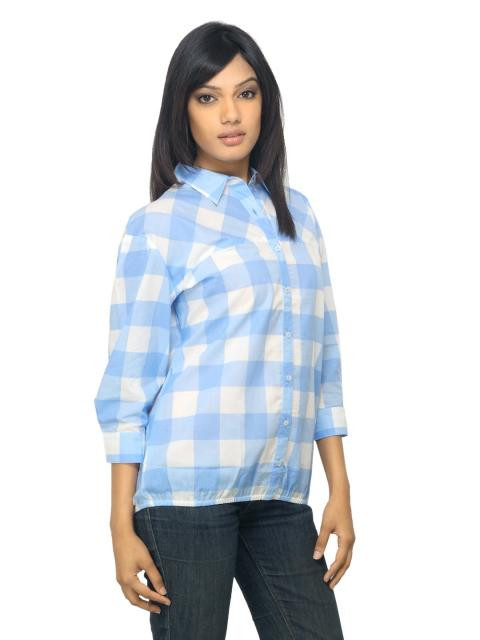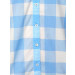 Blue and white check shirt, has a spread collar, long sleeves with buttoned cuffs, buttoned placket and an elasticated hem