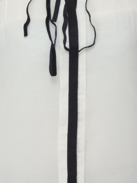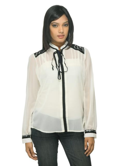 Cream sheer shirt made of a blended fabric with a soft drape, has a mandarin collar, full concealed buttoned placket, long sleeves with buttoned cuffs, velvet tie-up detail at the neck, lace detailing at the back yoke, shoulder and cuffs, pin-tucks from the shoulder and a curved hem