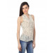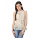 White printed shirt made of blended fabric, has a mandarin collar with a split neckline, full buttoned placket, is sleeveless and has a curved hem