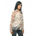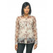 Printed beige sheer shirt made of a blended satin fabric, has a spread collar, full buttoned placket with wooden buttons, long sleeves with double buttoned cuffs and a curved hem