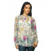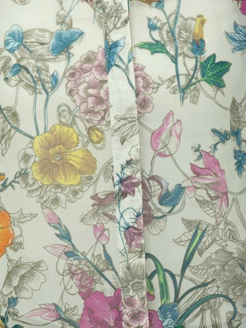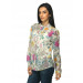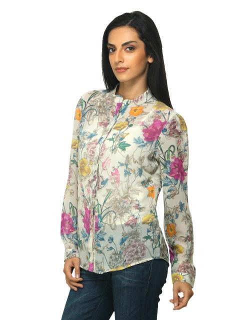 Off white floral shirt made of blended fabric, has a round neck, full buttoned placket, long sleeves with buttoned cuffs and a curved hem