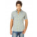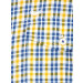 Yello and blue checked shirt made of 100% cotton, that has short sleeves, white stitch detailing, blue checked panel on the inseam of the collar, buttoned placket, two patch pockets on the chest, embroidered brand logo over the left chest pocket and curved hemline