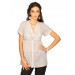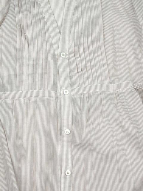 Light brown and white striped shirt with pin tucks on either side, pleated tucks on either side of the placket, mandarin collar, rolled cuffs with buttoned flaps, tie-ups on the sides of the waist with insert panel on the front and back, vented hems and full-length buttoned placket