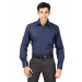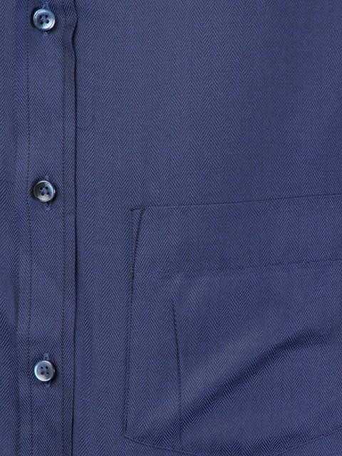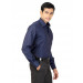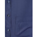 Solid dark blue shirt made of 100% cotton, has full cuff sleeves, full front button placket with a tipped collar, patch pocket on left chest and a curved hem