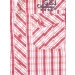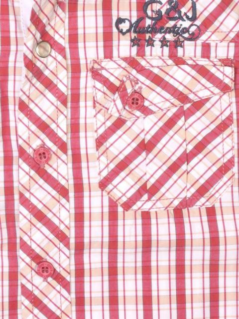 Red and white checked shirt, has short sleeves, patch pockets on the chest and a curved hem