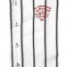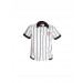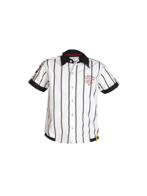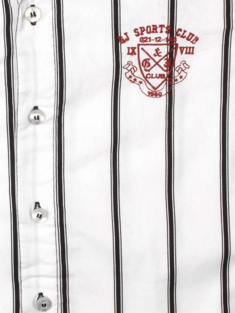 White shirt with black striped, has short sleeves, embroidery on the chest, applique on the right sleeve, a buttoned placket and a curved hem