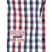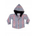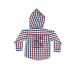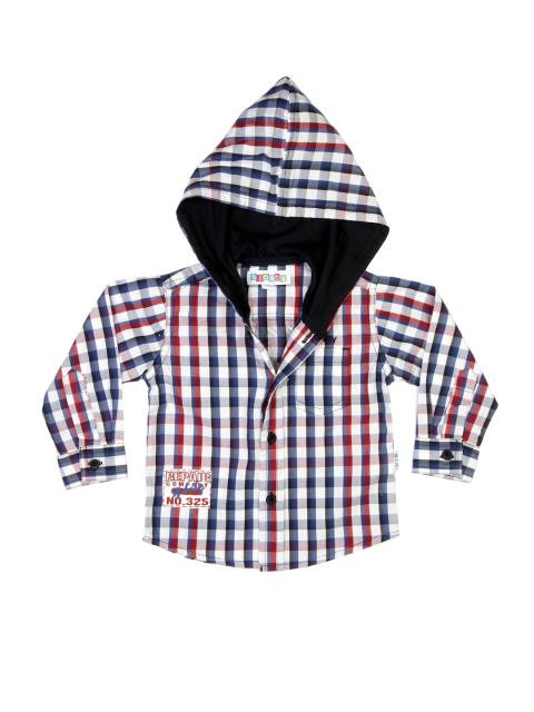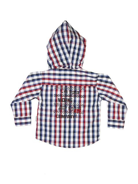 White full-sleeve shirt made of 100% cotton, has blue and red checks, a hood, foldover sleeves with a mid-sleeve button, tipped collar, stitch detailing above the two pockets on either chest, print on the back with embroidery, and a full length button placket