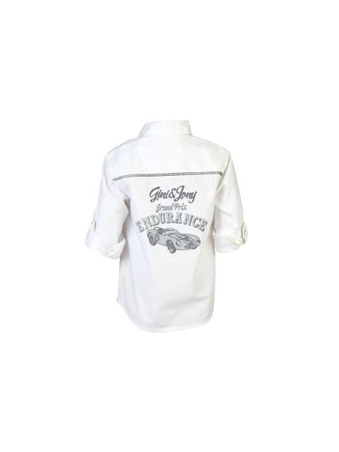 White full-sleeve shirt made of 100% cotton, has foldover sleeves with mid-sleeve buttons, tipped collar, stitch detailing above the two pockets on either chest, print on the back and a full length button placket