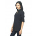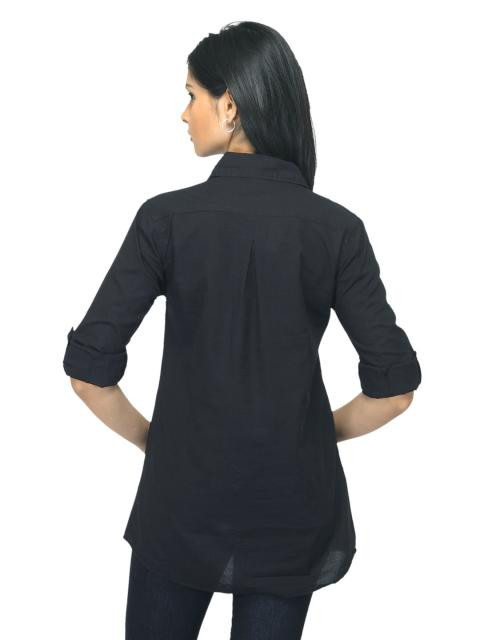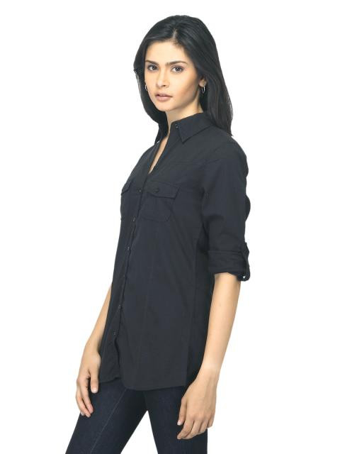 Black shirt made of 100% cotton, has a spread collar, long sleeves with buttoned cuffs, mid buttoned flaps, full buttoned placket, buttoned pockets on the front, an inverted pleat at the back and a curved hem