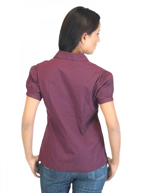 Purple shirt made of 100% cotton, has a spread collar with a split neckline, short puff sleeves, a full buttoned placket and inverse pintucks at the midriff