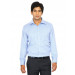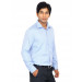 Blue full sleeves shirt with white stripes, made of a cotton and polyester blend, has a patch pocket on the left chest, a full length buttoned placket and a slightly curved hemline