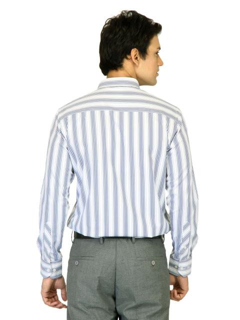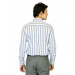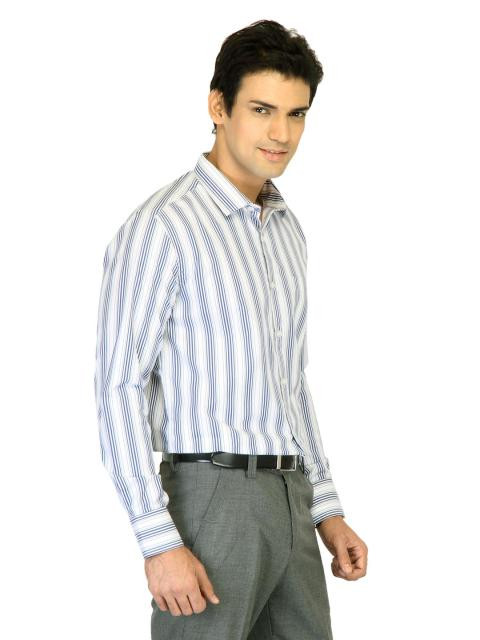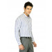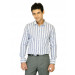 White full sleeves shirt with dark blue stripes, made of cotton and polyester blend, has a patch pocket on the left chest, full length buttoned placket and curved hemline
