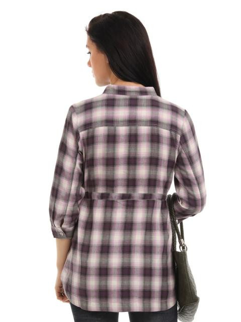 Purple checked, woven shirt, has a mandarin collar with a split V neckline, full buttoned placket, pint tucks from the shoulder on either side of the neckline, three quarter sleeves with buttoned cuffs, drawstring tie at the waist, back yoke and curved hemline