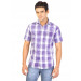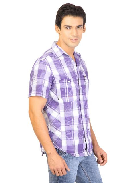Purple and white checked half-sleeve shirt made of 100% cotton, has shoulder panels, two chest pockets with red stitch detailing and discreet print of 'Kansas City' on the left pocket, a full length buttoned placket, brand name printed on the right sleeve and a curved hemline