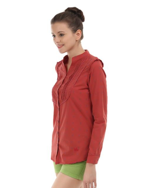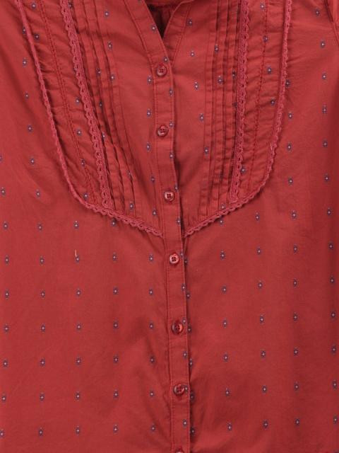 Red printed shirt, has a mandarin collar with a slit V neckline, full buttoned placket, long sleeves with buttoned cuffs, back yoke, gathers below the back back yoke, lace detail with pink tucks around the placket on the chest, lace detail at the cuffs and at the hemline, curved hemline and elasticated at centre back