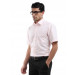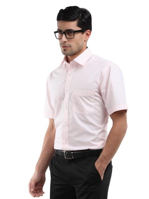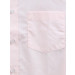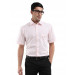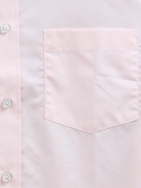 Pink formal shirt with white pinstripes, has short sleeves, spread collar with buttoned front placket, patch pocket on left chest and a curved hem