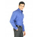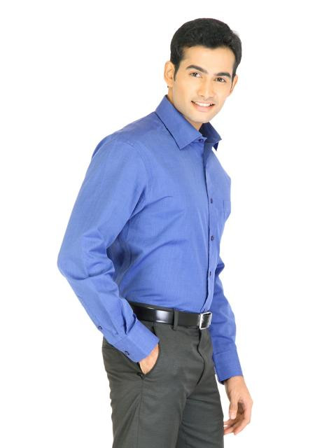 Blue shirt made of 100% cotton, has full sleeves with buttoned cuffs, tipped collar with buttoned front placket, patch pocket on left chest and a curved hem