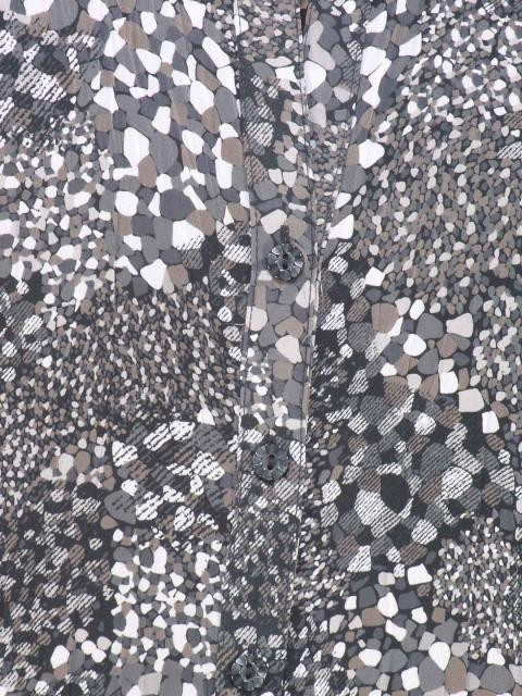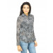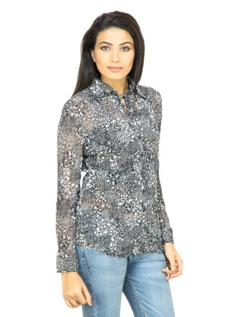 Printed black shirt, has a collar with a buttoned placket, tie-ups at the collar and long sleeves with buttoned cuffs and curved hem