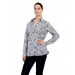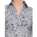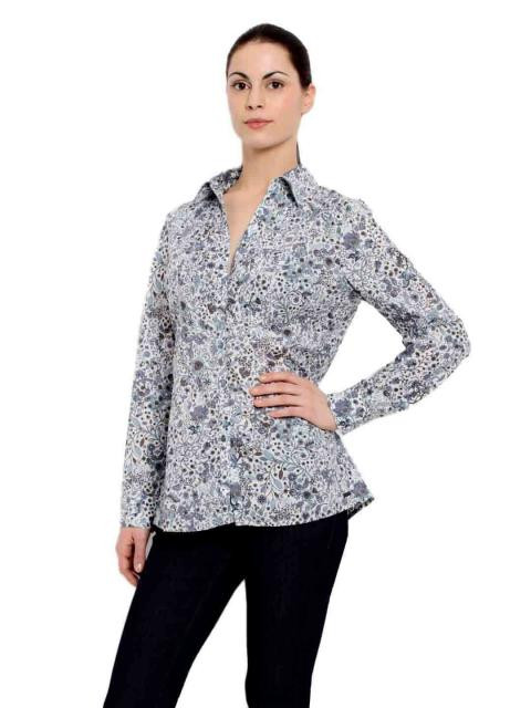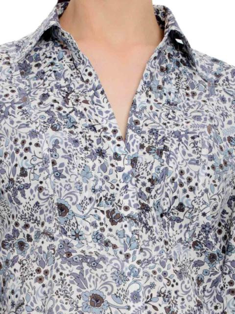 White shirt with blue and purple floral print made of 100% cotton, has long sleeves with two button cuffs, spread collar with v-neck, button placket, bib panel at front with pin-tucks, tie at back and a curved hem