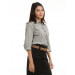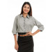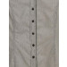 Grey and white shirt, has three quarter sleeves with buttoned cuffs, open spread collar without a top button, full buttoned placket with tipping and a curved hemline