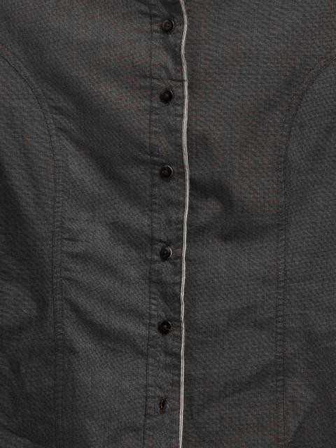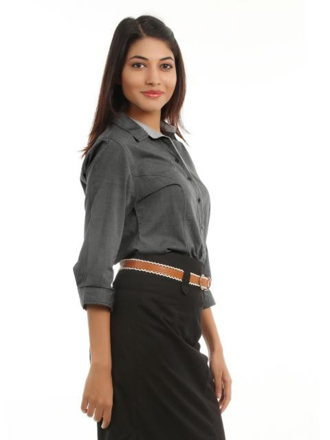 Charcoal grey shirt, has three quarter sleeves with buttoned cuffs, open spread collar without a top button, full buttoned placket with tipping and a curved hemline